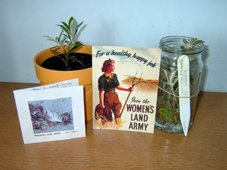 And this is the second batch, these twiglets are more tricky, they are NZ daisybushes, the plant in the pot is already rooted and I am keeping it in the pot inside until it is much bigger, the little card was with the first batch it is a tasteful photo by Jane Glue, the other photo is a touch appropriate (thought I’d say it before someone else did), I think I will put some of these tricky ones in pots and some in the sheltered front garden, fingers crossed…..