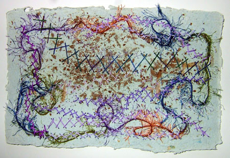 The first stitch was herringbone, I have used a paper that has lavender buds in it (amazingly it still smells a little) threads are, embroidery silk, stranded embroidery cotton and a variegated fine tube knitting yarn, just random stitching,