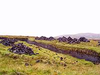 Of course the cutting was done by a gang of men. They had a cooked breakfast, packed lunch with flasks of tea, then dinner with whisky after and money too. They used a treasgair for cutting the peat and the nice row of peats at the top of the bog was called the garaidh. The treasgair isn't used much nowadays as most have converted to oil and the peat cutting tractor has replaced it.