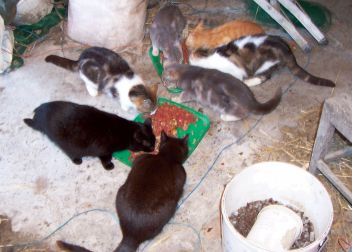 A bunch of the cats chowing down in the old dairy