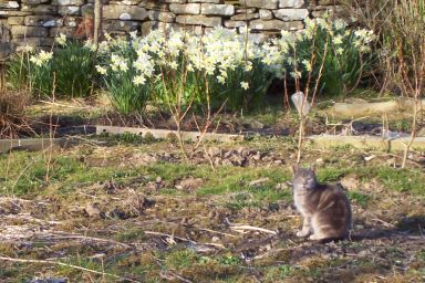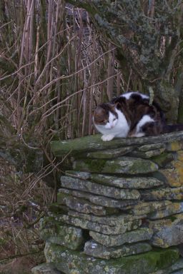 Millie perched on the garden wall. Her mother is "Molly" and looks almost exactly alike.