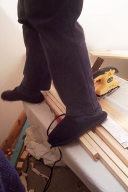 So...Erlend slaves away all day and half of the night on the farm - and then comes into the house and works hard at putting up wall-to-wall shelving in our middle bedroom!