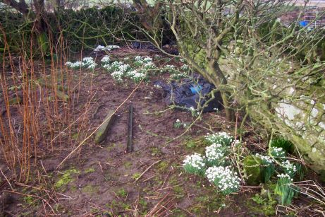 Snow Drops **Drool Drool** (one corner of the garden containing trees, apple trees, Snow Drops, black current bushes and ... bruck.)