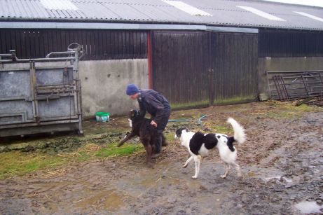 Erlend came bursting out of the side door of the byre being towed by a very wild calf! You wouldn't BELIEVE how strong these little buggers are! (Zeb is trying his best to herd the calf but he's far more Borzoi then Collie!!)