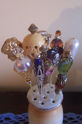 Pretty yet totally fake antiques. (They are real hatpins - but made with modern plastic beads etc.) I call it, "Cheap-wad Chic."