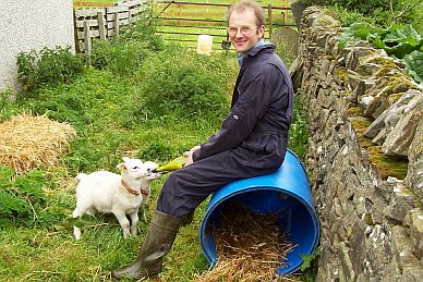 Erlend then took the beesmilk and put it into a big syringe and then, after passing a tube down into the ram lamb's stomach, he fed the little boy his first meal! He also gave the lambs a jag of Vitiman E and soon enough the ram was merrily sooking away with his sister!
