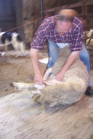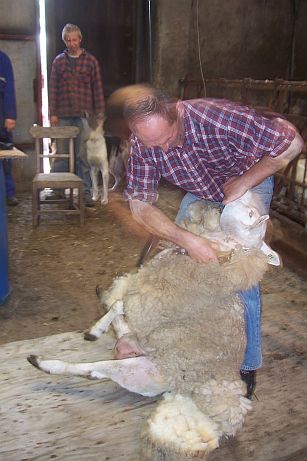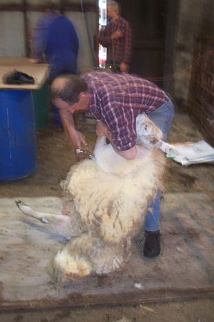 The sheep was eased this way and that - it seemed as if she were being slowly rolled out of her fleece! (You can see a muzzle poking out behind his knee...)