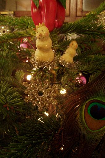 Fun snowman ornament with even funner glitter snowflake ornament below. (And peacock feather off to the side...)