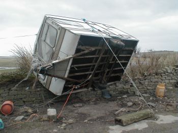 We did hae a caravan, securely tied doon, until Saturday nights storm force winds. Me other half had tae gaun oot and smash a window to get oot the dog and cat who overnight in the van (not being housetrained..we got them both that way!) who were both, luckily, ok if a peedie bit scared. We hae a fair bit o` storm damage but are managing fine...when the Hydro went off overnight and a` morning, we used oor wee generator tae power the freezers and me incubator...I dinnae ken how long the thing was withoot heat so am keeping me fingers crossed for the eggs...