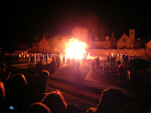 It took just a few minutes for over 800 torches to fly through the air and starting burning the galley. A barrage of fireworks went off overhead, and the spectacle had reached its climax. The ship caught fast, the flag started to singe, and the mast toppled, but it took longer for the prow to catch alight. We left it blazing and headed for the TA hall.