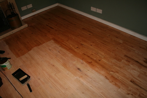 Well, while we await the kitchen, I thought its time to complete the lounge oak floor its been laid a few months now and has settled well, so on Saturday I sanded the complete area. On Monday (today) the first coat will go on while the kids are at school.