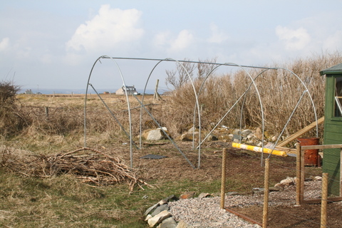 The polytunnel frame is now up, this took longer than exspected due to the wet weather, now awaiting the warmer weather to get the skin on.