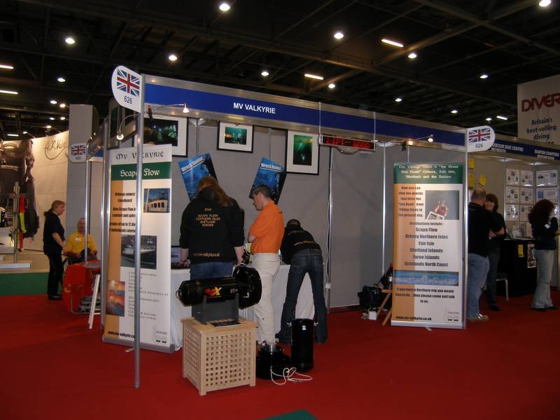 Getting to the Excel centre was slightly stressful, but only because of the other 10,001 people on the road wanting to be in exactly the same bit we are currently sat on. On arrival bits of paper are collected and little blokes in yellow jackets and with walkie talkies jabbering point us towards the loading doors. Dive shows on Fridays are manic. There are the smug stands already set up and snoozing under their tarpaulins complaining about the noise. Other stands look like an anthill with bodies climbing all over them to cable tie dive gear to unimaginable heights. Floor space costs, headroom is free. Our stand is bare, simply a carbon copy of our order sellotaped to the wall. Slowly we carry all of our boxes and bags to the stand and begin the process of transforming something this blank canvas into a stand that will entice people to come to Orkney and dive with us. Rob arrives and delivers the four scooters - a Diver Propulsion Vehicle - to the stand. These are diver bling. Expensive toys, hilarious fun and the preserve of pretty much technical divers. However, we have three of them onboard the boat, hence them being at the show to catch peoples attention.