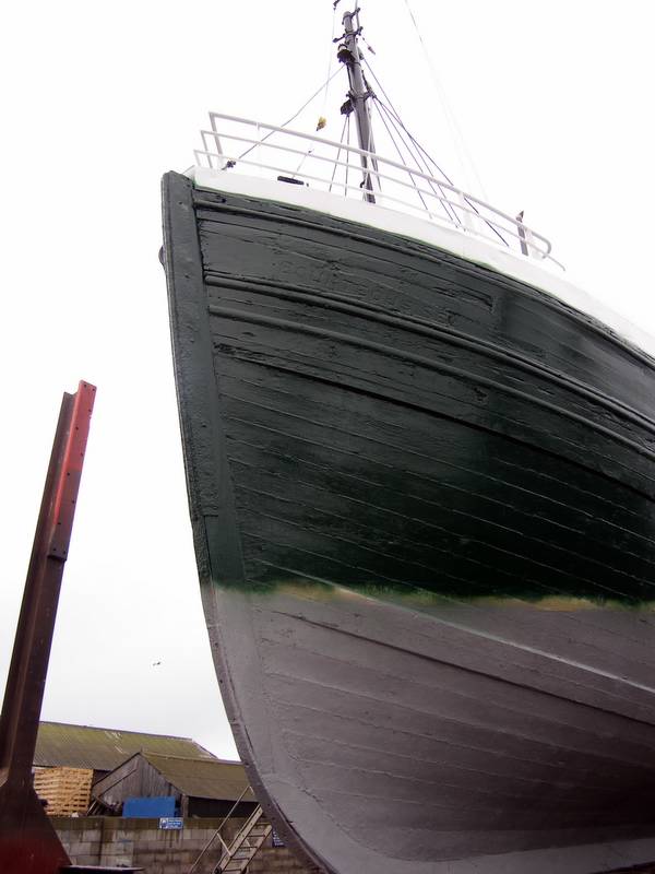 People who don't own boats, their contact being the occasional ferry journey or even less will maybe struggle to understand the affinity a person feels to a boat. It somehow becomes an extension of yourself. I became Valkyrie, over the radio we are Valkyrie, not Hazel and Helen. To other boats, we are Valkyrie. We care for her, make sure she is working correctly and looking good. We are the embodiment of the boat. I wonder what will happen to her when she comes to the end of her life with us. By the standards of modern fishing boats she is an ancient relic, outdated and obsolete. By dive boat standards she is excellent for what we want, fitted out so well and now with so many of the things divers want. Having had the decades of paint taken off the hull with a power washer with a rotary head on it revealed a beautifully sound set of wooden planks. Four days were spent in the driving snow, sleet and rain. Each pass of the jet of water sent flakes of paint flying, mainly into my eyes, nose, mouth, ears and somehow through the five layers of fleece and into my bra. Hands so cold they become useless claws, the pain so intense as the blood returns for the tenth time in a morning. The best thing about this was being let loose in a scissors lift – a motorised platform which can lift you forty feet into the air to allow you to reach all the difficult bits. I loved driving the platform around the boat and suddenly being king of the castle above everyone else. The fact that it bounced when you walked was great fun, but an opinion not shared by Hazel who was less than keen on heights and didnt appreciate me showing her quite how much they bounced. The hurry was to allow the greatest chance of getting a decent day to get paint back onto the bare wood. Once the upper hull had been stripped back using the power washer it was taken back to wood with heat guns to give a totally sound surface for the new paint to stick to. A layer of grey primer, a layer of grey undercoat and then her final coat of glossy green.