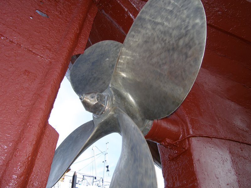 The shiplift is a cradle that is lowered into the water on a platform controlled by four giant winches, their thick black grease laden cables looping around pulleys over a foot across. Slowly we are pulled from the water and towed to our space in the ship yard. I descend the long ladder to the ground and get my first look at the hull without the aid of my diving gear for over a year. Barnacles encrust the keel and engine cooling pipes, their white shells stark against the dark antifoul paint.