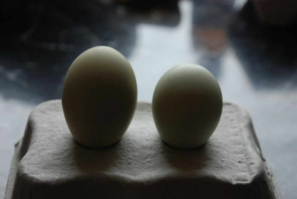 Large green egg is from one of the Shetland hens... The smaller green egg ... I managed to breed a Shetland batam hen but she has no mate so she is a one off !