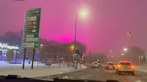 Када је у четвртак увече снег, који ретко пада у енглеској области Вест Мидлендс, покрио град Бирмингем, становници су угледали редак призор: мистериозну светлост која је обасјала небо и учинило га розим.