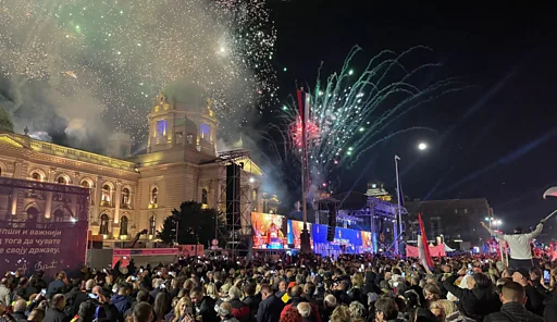Vučićev govor je prekidan povicima „Aco, Srbine", a posle obraćanja je usledio veliki vatromet.