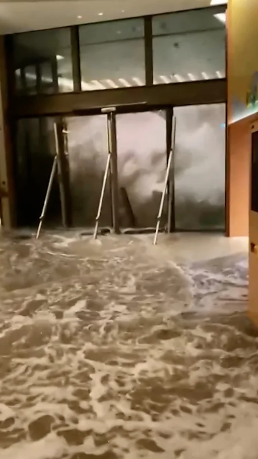 U jednom hotelu, snažan vodeni talas je razbio staklena vrata, oborivši radnika.