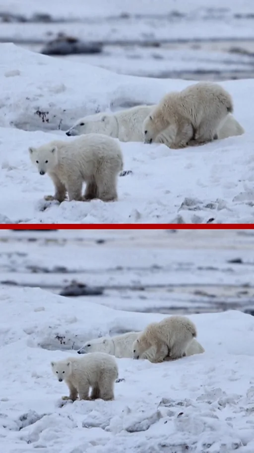 Петогодишња женка и њени младунци од десет и 11 месеци снимљени су током годишње миграције медведе дуж Западног залива Хадсон близу Черчила, у провинцији Манитоба, града познатог по популацији поларних медведа.