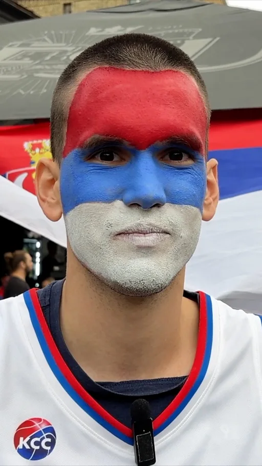 Izbrojao sam u jednom trenutku petoro navijača Srbije - jednog u vaterpolo kapici, troje prijatelja sa zastavom i još jednu devojku takođe ogrnutu srpskom trobojkom.