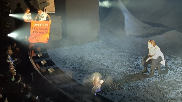 Žena i muškarac, aktivisti ove grupe, popeli su se na binu pozorišta Rojal Druri Lejn u ponedeljak uveče.
