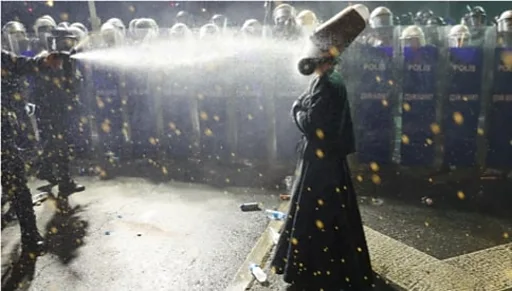 Fotografija demonstranta u Istanbulu, odevenog u tradicionalnu dervišku nošnju obično povezanu sa misticizmom sufizma, kako stoji ispred kordona policajaca koji koriste biber sprej, postala je viralna u martu.