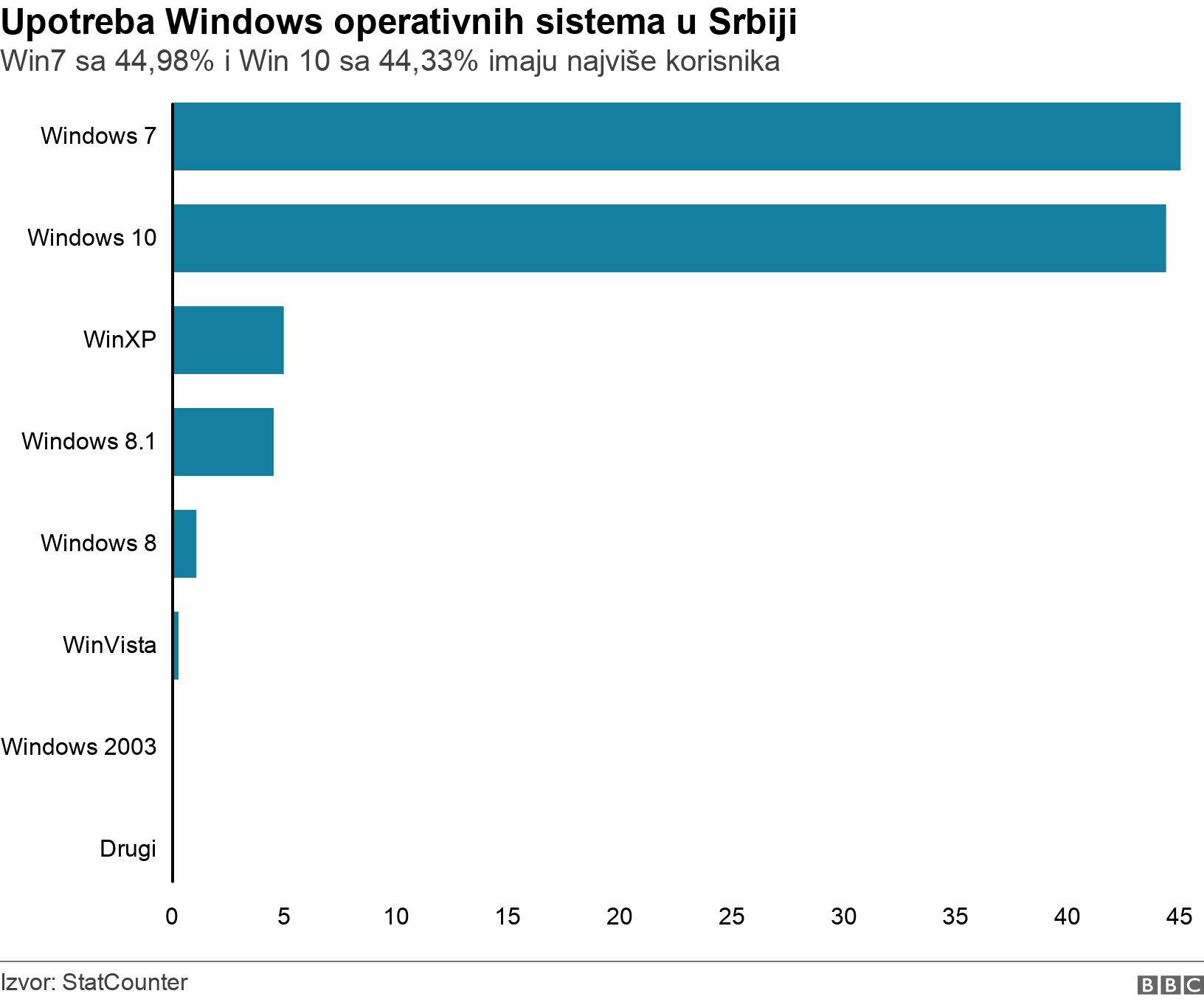 Čak 88,37 odsto tržišta u Srbiji koristi Windows operativni sistem. Od ukupnog broja korisnika desktop verzije, njih 44,98 odsto upotrebljava Windows 7, pokazuju podaci analitičkog sajta StatCounter za 2019. godinu.
