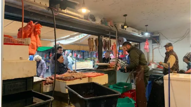 „Nemoj mene sad, nema vremena, vidiš", kaže mlađi muškarac dok za trenutak prekida čišćenje ribe da pokaže oko sebe koliko još ima posla.