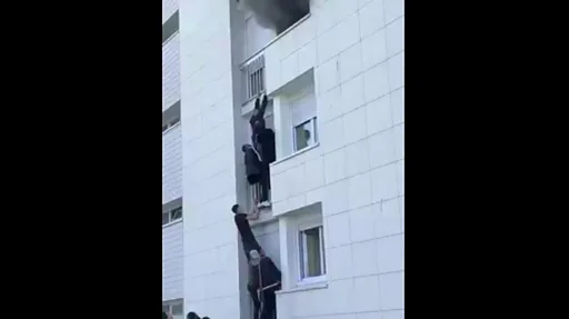 Na dramatičnim snimcima vidi se kako su se mladići popeli uz spoljnu stranu zgrade i pomogli roditeljima sa decom da pobegnu iz stana na trećem spratu,