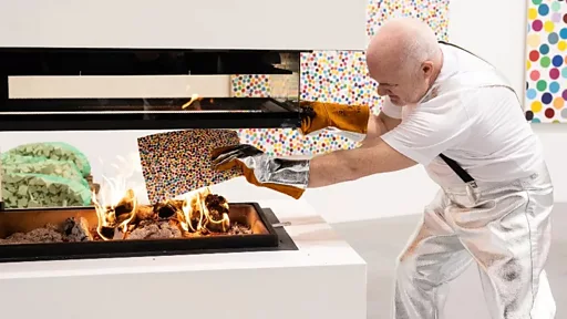 Hirst, dobitnik Tarnerove nagrade za umetnost, sa asistentima je hvataljkom ubacivao umetnine sa gomila u vatru, što su mogli da gledaju posetioci u galeriji, ali i drugi ljudi putem strima.