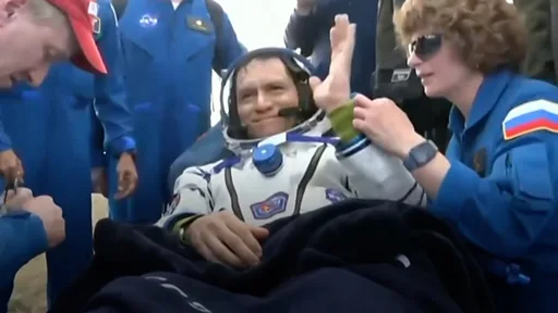 Sa širokim osmehom na licu, Rubio je prevezen sa svemirske letelice Sojuz MC-23 nakon što je sletela bezbedno na Zemlju u oblaku prašine blizu grada Žeskazgana u Kazahstanskoj stepi.