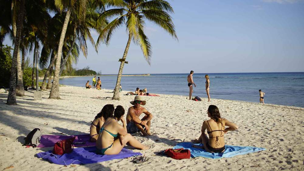 Док сунце залази баца дугачку сенку по плажи у Заливу свиња. Групице туриста одмарају се испод палминог дрвећа, пијуцкају хладно пиво или пију кубански рум из љуске кокосовог ораха, које продају локалци.