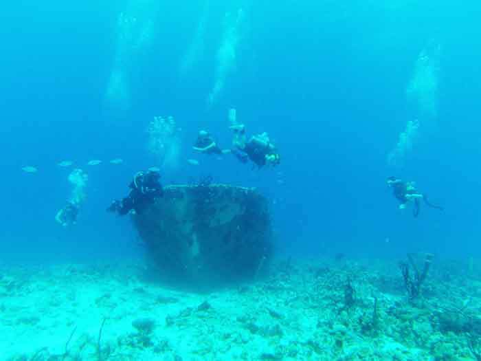 Наш инструктор Реј повео нас је до готово очуваног гребена. Група Канађана ужива у истраживању потопљеног брода.