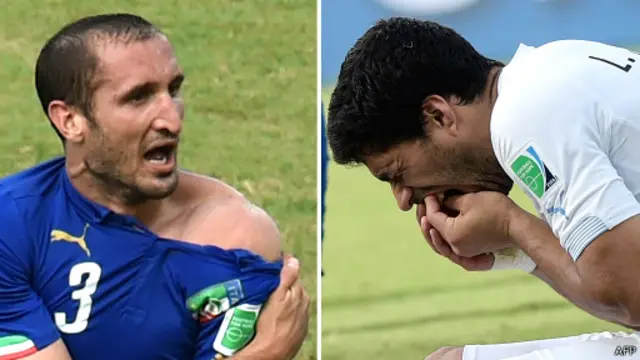 ඉතාලි පාපන්දු ක්රීඩක ජෝජියෝ කෙලිනිගේ උරහිස මතට ස්වාරෙස් ඔහුගේ මුඛය තදින් තබන ආකාරයකුයි රූප දර්ශන වල සටහන් වී ඇත්තේ.
