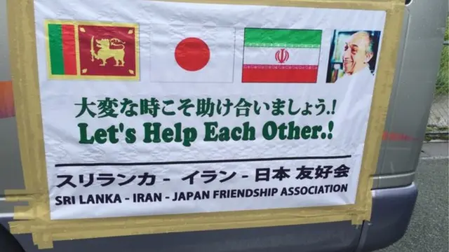 ජපානවාසීන්ගේ ගෞරාවාදරයට පාත්ර වී සිටින හිටපු ශ්රී ලංකා ජනාධිපති ජේආර් ජයවර්ධනගේ ඡායාරූපයක්ද සහිත බැනරයක්ද සමගින් ශ්රී ලංකා-ඉරාන-ජපාන මිත්රත්ව සංගමය බස් රථ මගින් ආහාර රැගෙන එන ආකාරයද එම පණිවුඩවල දැක්විණ.