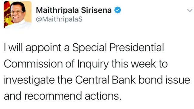 මහ බැංකු බැඳුම්කර ගැටලුව විමර්ශනය සඳහා මේ සතිය තුළදී තමන් විශේෂ ජනාධිපති කොමිෂන් සභාවක් පත් කරන බව ජනාධිපති මෛත්රිපාල සිරිසේන පවසයි.