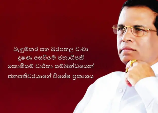 ජනාධිපති මෛත්රීපාල සිරිසේන ඒ බව සඳහන් කළේ බැඳුම්කර කොමිසමේ වාර්තාව සහ බරපතල වංචා දූෂණ සෙවීමේ ජනාධිපති පරීක්ෂණ කොමිසමේ අවසන් වාර්තාව මූලික කරගනිමින් මාධ්ය අමතා විශේෂ ප්රකාශයක් කරමිනි.