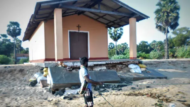"මාස හතරකට කළින් මුහුද තිබුණේ අපේ පල්ලියට මීටර් දෙසීයක් විතර ඈතින්. දැන් මුහුද තියෙන්නේ පල්ලිය ඇතුළේ. මෙහෙම ගියොත් අපට සිද්දවෙන්නෙත් මුහුදට පනින්න තමයි."