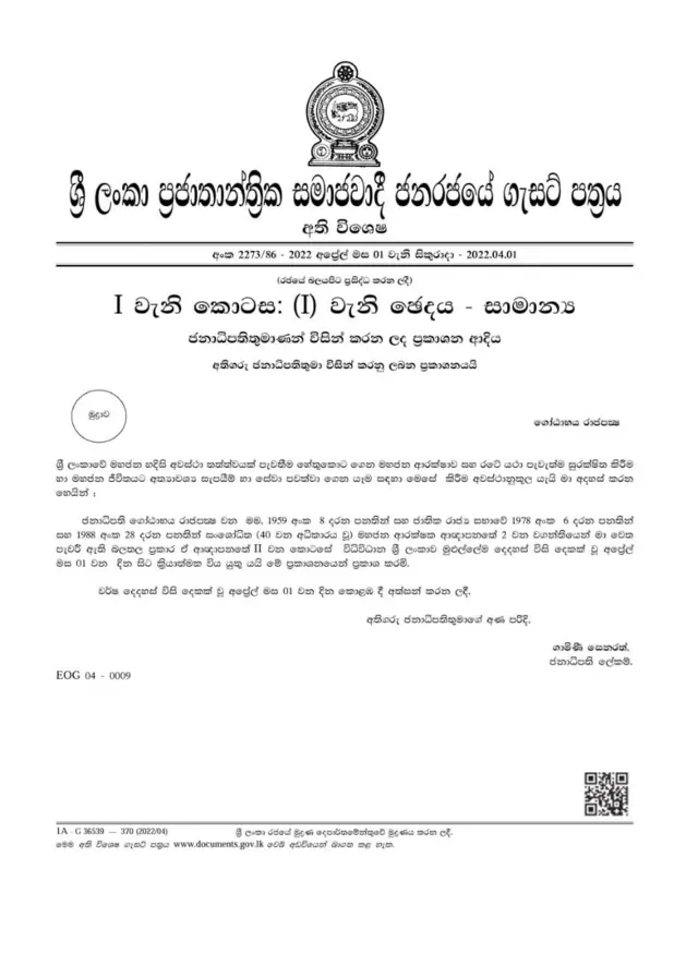 රජයේ ප්රවෘත්ති දෙපාර්තමේන්තුව සඳහන් කළේ, ජනාධිතිවරයා නිකුත් කර ඇති ගැසට් නිවේදනය අනුව අප්රේල් 01 වැනිදා සිට දිවයින පුරා හදිසි නීතිය පැනවෙන බවයි.