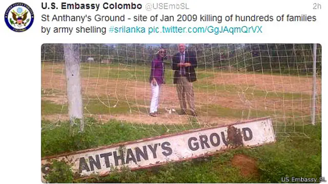 යුද අපරාධ සම්බන්ධ ඇමෙරිකා එක්සත් ජනපද තානාපති <link type="page"><caption> ස්ටීවන් ජේ රැප්</caption><url href="http://www.bbc.co.uk/sinhala/sri_lanka/2014/01/140106_war_crimes_us_envoy.shtml" platform="highweb"/></link> සහ ඇමරිකානු තානාපතිනි මිෂෙල් සිසොන් ගේ, පුදුමාතලන් හිදී බ්රහස්පතින්දා ගන්නා ලද බව සඳහන්, ඡායාරූපයක් ද රැගත් ට්විටර් පණිවුඩයකින්, එක්සත් ජනපද තානාපති කාර්යාලය පවසා ඇත්තේ ‘ශාන්ත අන්තෝනි පිටිය - යුද හමුදා ෂෙල් ප්රහාරයෙන් 2009 ජනවාරියේ පවුල් සිය ගණනක් ඝාතනය කැරුණු ස්ථානය’ යනුවෙන්.