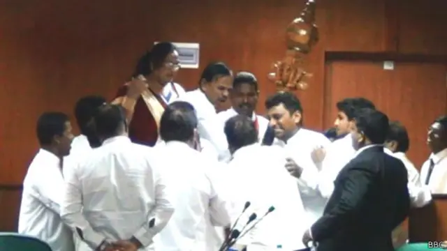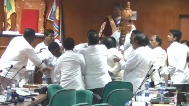 අද රැස්වීම ව්යාකූල තත්වයක පවතිද්දී එක් මන්ත්රීවරයකු විසින් සෙන්කෝලය පැහැර ගැනීමත් සමගයි ගුටිබැට හුවමාරුව සිදු වී තිබෙන්නේ.