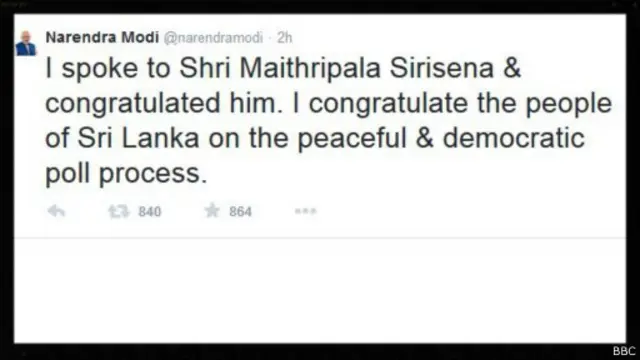මේ අතර ජනපති ධුරයේ දිව්රුම් දීමට නියමිත විපක්ෂයේ පොදු අපේක්ෂක මෛත්රිපාල සිරිසේනට දුරකතනයෙන් කතා කොට සුභ පැතූ බව ඉන්දීය අගමැති නරේන්ද්ර මෝදි පවසයි.