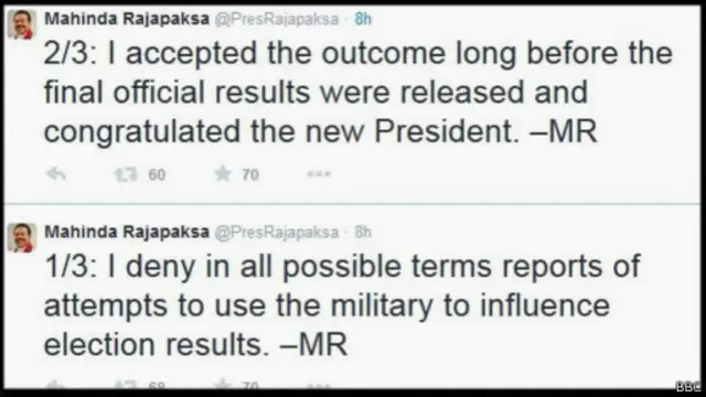 ‘ට්වීටර්’ පණිවුඩයක් නිකුත් කරමින් හිටපු ජනාධිපත් මහින්ද රාජපක්ෂ වැඩි දුරටත් කියා සිටියේ ජනතා මතය පිළිගෙන ජනාධිපතිවරණ නිල අවසන් ප්රතිඵලය නිකුත් වීමට මත්තෙන් තමා නව ජනාධිපති මෛත්රිපාල සිරිසේනට සුභ පැතූ බවයි.