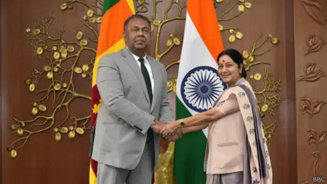සෙනසුරාදා ඉන්දියාව බලා පිටත්ව ගිය විදේශ අමාත්ය මංගල සමරවීර අද ඉරිදා ඉන්දීය විදේශ අමාත්යවරිය සුශ්මා ස්වරාජ් හමු වී සාකච්ඡාක් පවත්වා තිබේ.