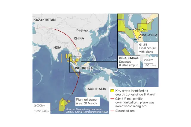 ඉන්දීය සාගරයේ දකුණු කලාපය නැව් සහ ගුවන් යානා යොදා ගනිමින් දැඩි පිරික්සුමකට ලක් කළත් යානය සම්බන්ධයෙන් කිසිදු ළකුණක් වත් දක්නට ලැබී නැති බවයි වාර්තා වන්නේ.