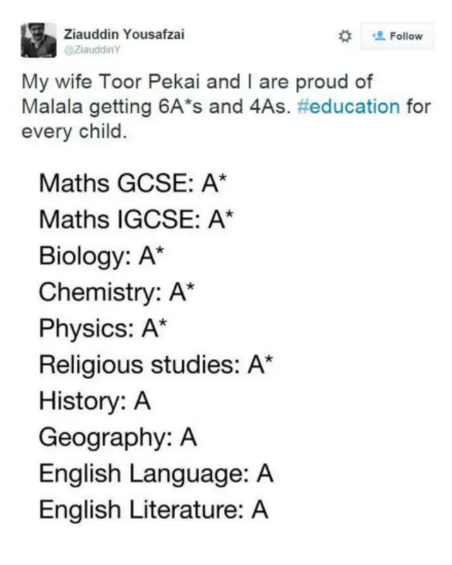 සිය දියණියගේ විභාග ප්රතිපල ට්විටර් වෙබ් අඩවියේ පළ කළ මලාලාගේ පියා සඳහන් කර තිබුනේ තමන් සහ තම බිරිඳ බෙහෙවින්ම ආඩම්බර වන බවයි.