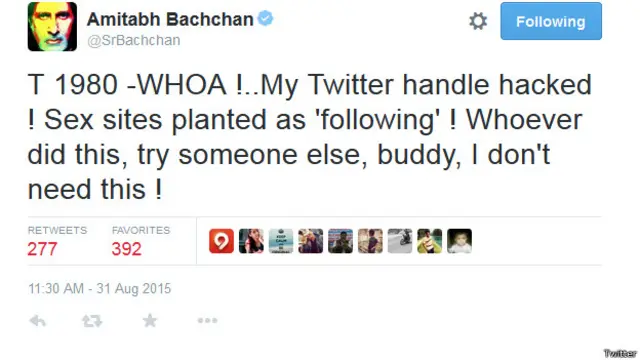 තම ට්විටර් පිටුවට හකරුන් ඇතුළු වී ඇති බව සඳහන් වන්නේ අමිතාබ් බච්චන් විසින් පසුව නිකුත් කරනු ලැබූ ට්විටර් පණිවුඩයකයි.