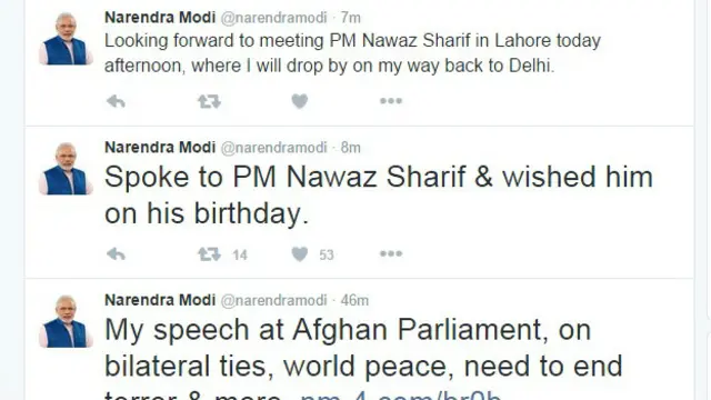 අගමැති මෝඩි ඉතා හදිසියේ සිදු කෙරුණ සිය පකිස්තාන් සංචාරය පිළිබඳව හෙළි කරන ලද්දේ ‘ට්විටර්’ පණිවුඩයක් මගිනි.