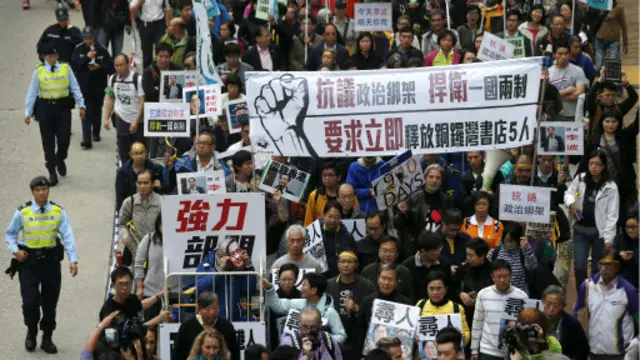 පොත් සාප්පු කරුවන් පස් දෙනෙකු අතුරුදහන් වීම පිළිබඳව කෝපයට පත් හොංකොං වැසියන් දහස් ගණනක් වීදි බැස උද්ඝෝෂණය කළහ.